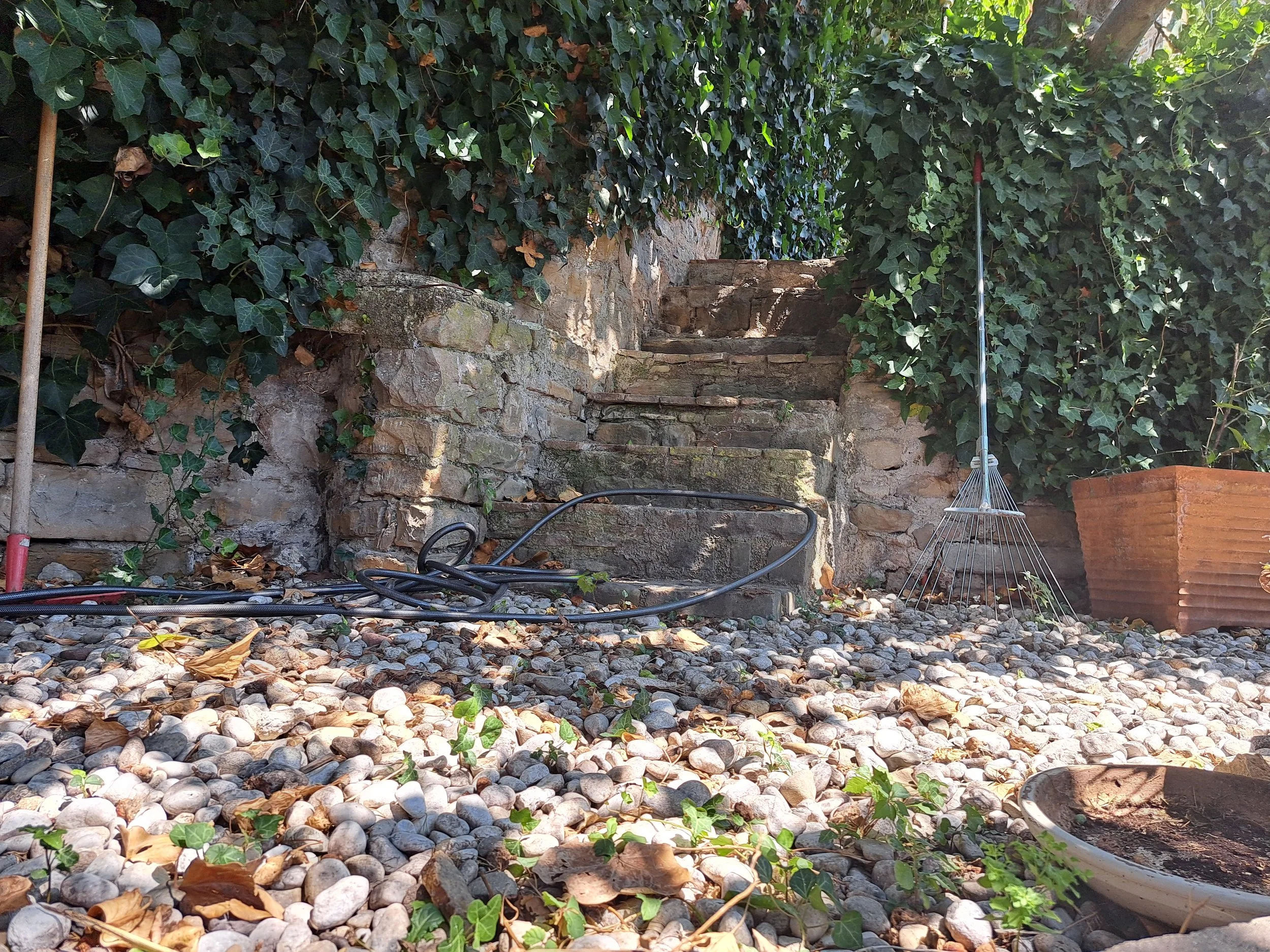 Vrt je bil preveč zaraščen. Oljka, čeprav čudovita, je zrasla brez nadzora, figa na zgornji terasi pa je s svojimi vejami zadušila prostor. Bršljan je preraščal zidove in se že prepletal sam s seboj.